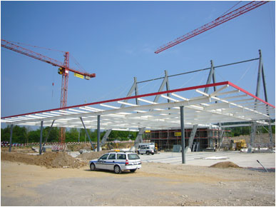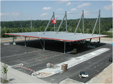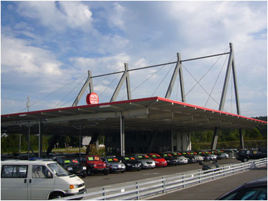 Auto Discount Uster AG Egg Hanimann+Flückiger AG Überdachung Autoverkaufscenter in 8610 Uster -offene Überdachung 62x57m -Dach auf 4 Pylonen (h=28m) aufgehängt -Gesamttonnage Stahl : ca 390 to | |
