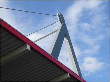 Unsere Leistungen -Entwurf Dachkonstruktion mit Pylonen -Ausführungsstatik Stahlkonstruktion mit Detailknoten -Werkstattpläne Stahlbau |